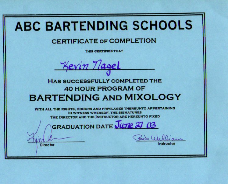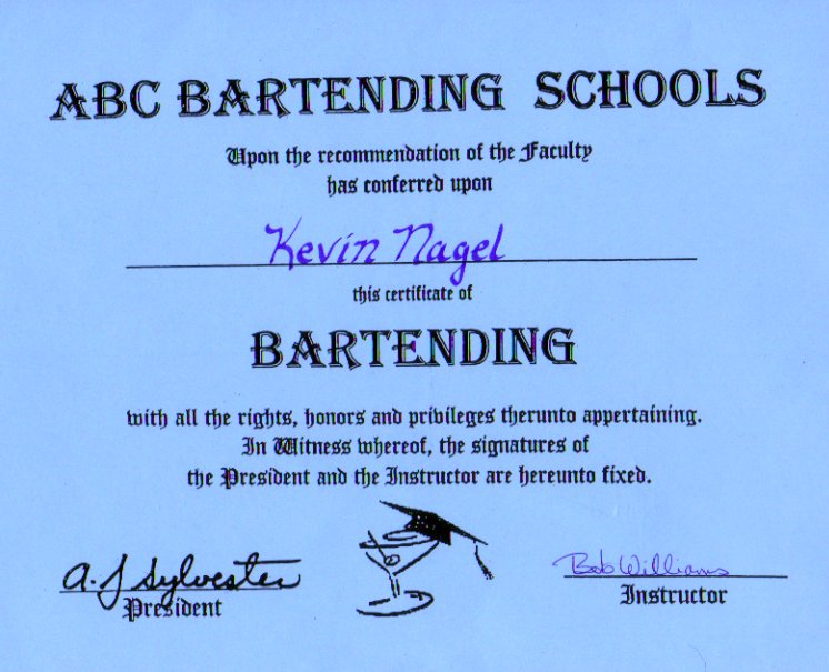 ABC Bartending School - 40 hours - Certificate (front, back)